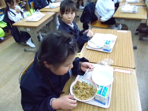 給食開始!(1年・6年) 4月10日(木) 1年生の給食は,水曜日から始まりました。来週くらいまで,6年生が来て配膳してくれています。6年生は「人のために力を使う」ことを意識して,1年生が食べられる量を考えながら配膳していました。1年生もマスクをして,静かに待つことができていました。1年生も,これから給食当番の仕方を少しずつ覚えていきます。