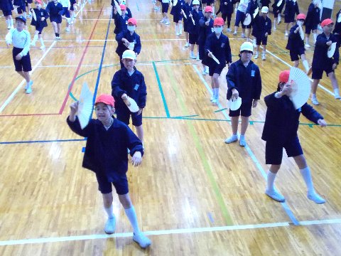 ええじゃん合同練習(4・5年) 4月15日(火) 4月27日の尾道みなと祭りに向けて,4年生・5年生合同で,ええじゃんの練習を行っています。今日は,腕や足を伸ばすこと等,動きのポイントを意識して,練習していました。昨日の練習に比べて,かけ声がしっかりと出ていました。これから,ええじゃん委員を中心に,本番に向けてさらに高め合っていきます。