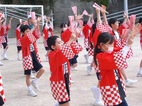 最後のええじゃん練習(4・5年) 4月25日(金) 4・5年生が27日のみなと祭りに向けて,最後の練習を行いました。5年生は,昨年度の3学期からリーダーを中心に自分たちで振付を考え,練習してきました。また,4年生もフォロワーとして,自分たちに何ができるのか考え,大きな声でかけ声を出したり,全力で踊ったりしていました。最後の振り返りで,5年生のリーダーが「本番当日,金賞めざして笑顔でがんばりましょう!」と伝えています。ええじゃん本番当日,ひびっ子の満開の笑顔が咲くことを楽しみにしていてください。