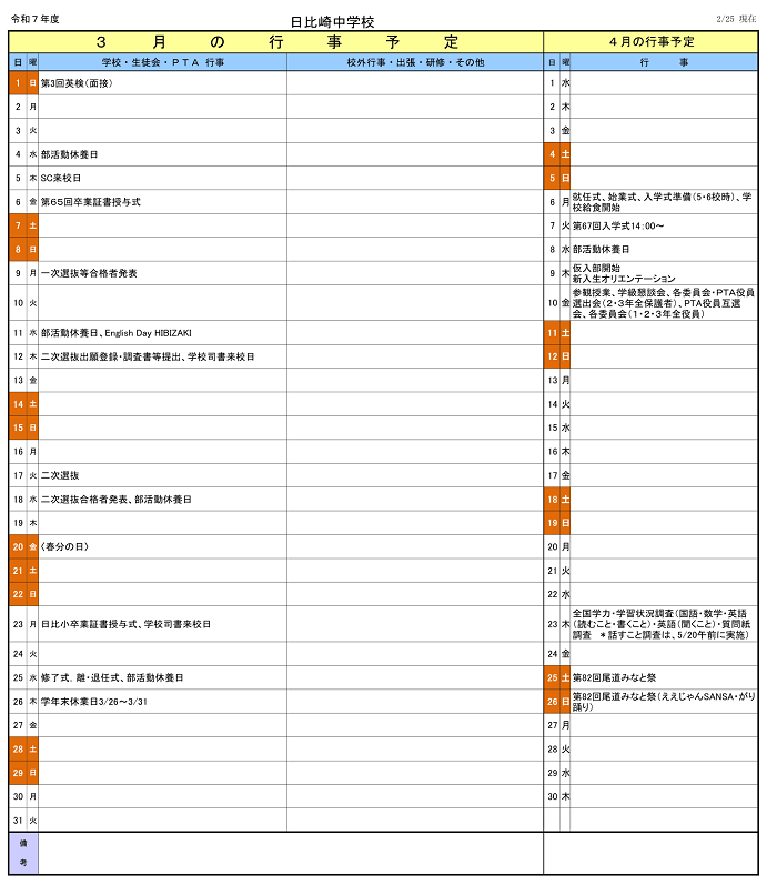 (令和8年2月25日現在) ※行事予定の変更・中止等がありましたら,できるだけ早めに,お知らせいたします。 月別行事予定 (PDF) 令和7年度 月別行事予定 一覧 5月・6月 (PDF) 6月・7月 (PDF) 7月・8月 (PDF) 9月・10月 (PDF) 10月・11月 (PDF) 11月・12月 (PDF) 1月・2月 (PDF) 2月・3月 (PDF) 令和6年度 月別行事予定 一覧 令和6年4月・5月 (PDF) 5月・6月 (PDF) 6月・7月 (PDF) 7月・8月 (PDF) 9月・10月 (PDF) 10月・11月 (PDF) 11月・12月 (PDF) 12月・1月 (PDF) 1月・2月 (PDF) 2月・3月 (PDF) 3月・令和7年4月 (PDF)