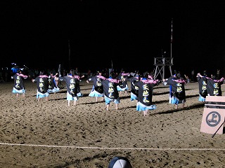 大勢の観客が見守ってくださる中で踊ります。元気よく声をかけ合い,息の合った舞を披露します。 -