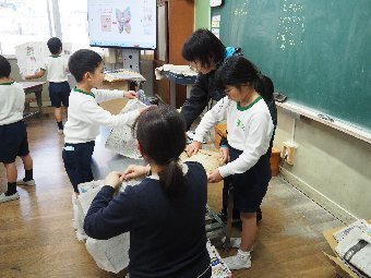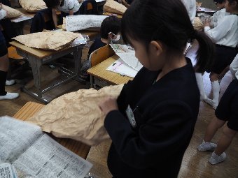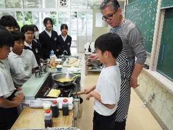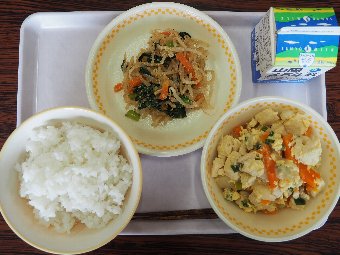 【放送原稿の紹介】今日の献立は,ごはん,牛乳,高野豆腐の卵とじ,ごま和えです。今日は乾物についてお話しします。乾物 とは昔から保存食として日本各地で作られてきた食品で,野菜や海藻類,魚介類などの食材を乾燥させて水分をカラカラになるまで抜き,常温で長い間保存ができるようにしたものです。水分が抜けることで保存性が高まるだけではなく,うま味や栄養成分がギュッと凝縮されるのが乾物のよいところです。乾物の種類はとても多く,給食でよく使われるものは,昆布やひじき,干しわかめ,干 ししいたけ,切干大根,高野豆腐,煮干し,かつお節,ごまなどがあります。今日は,高野豆腐を使った「卵とじ」と,ごまを使った「ごま和え」を作