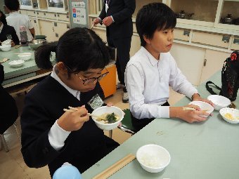 【放送原稿の紹介】今日の献立は,ごはん,牛乳,親子煮,小松菜のしらす和えです。みなさん,今日の朝ごはんをしっかり食 べてきましたか?朝ごはんは,一日の元気の源です。朝ごはんを食べると,午前中に活動するための準備が整います。朝ごはんを食 べていないと,エネルギー不足で集中力が欠けたり,疲れたり,イライラしたりすることがあります。もし,食べないことがある人 は,何でもいいので朝ごはんを食べてくるようにしましょう。また,食 べている人も,赤・黄・緑のバランスが整った朝ごはんを食べるようにするといいですね。今日も栄養バランスのよい給食を食べて,お昼からも元気に過ごしましょう。