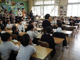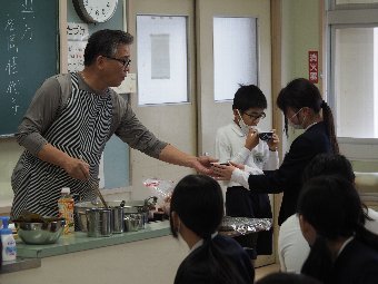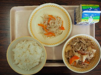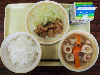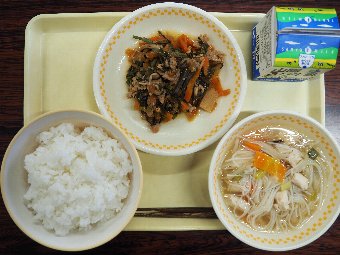 【放送原稿の紹介】今日の献立は,ごはん,牛乳,チキンチキンごぼう,春雨スープです。毎月19日は,「感謝・完食の日」です。食事は私たちの体をつくり,元気にしてくれる大切なものです。給食の一口一口には,野菜や牛・豚・鶏を育てたり,魚を釣ってくれる人,給食の材料を届けてくれる人(),給食を作ってくれる調理員さん,たくさんの人の力と心がつまっています。食べ物や作ってくれた人に「ありがとう」という気持ちを込めて,しっかり味わって食べましょう。感謝の心を持って食事をすることが,みなさんの体も心も元気にしてくれます。今日も感謝しておいしくいただきましょう。