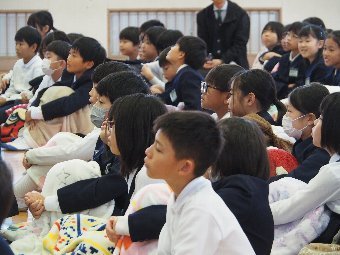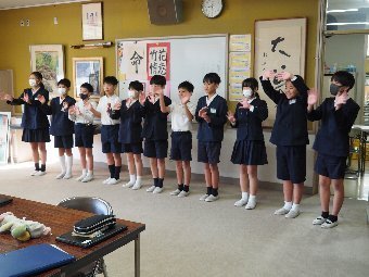 【放送原稿の紹介】今日の献立は,ごはん,牛乳,さばのしょうが煮,ゆでキャベツ,のっぺい汁です。今日は「感謝・完食の日 」です。みなさんの目の前にある食べ物 は,給食の調理員さん,野菜を育てる農家さん,漁師さん,肉屋さん,それらを配送して下さる方々の働きで食べることができます。このように多くの人たちによってつくられていることに感謝をし「いただきます。ごちそうさま。」と心を込めて挨拶をしましょう。そして多くの食べ物の命をいただいて私たちは生きています。その命を無駄にしないよう感謝して完食を目指しましょう。食事を残さないということはSDGs(エスディージーズ)にもつながります。「感謝・完食の日」だけではなく,いつも取り組めるといいですね。