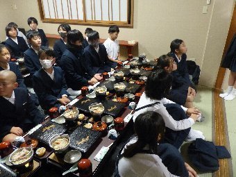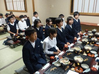 【放送原稿の紹介】今日の献立は,ごはん,牛乳,さばのしょうが煮,せん大根,豆腐のみそ汁です。今日は,和食の配膳についてふりかえってみましょう。和食を配膳するとき,ご飯は左側,汁物は右側に置きます。このようなきまりができたのは,室町時代 と言われています。当時,「左側に大事な物を置く」という風習がありました。ご飯を左側に置いたり,魚料理を盛りつけるとき,頭を左側に向けることも同じ理由です。和食の作法に,600年前の文化が残っているとは,驚きですね。今日の給食の配膳はきちんとできていますか?左にごはん,右に,豆腐のみそ汁その上に牛乳,その横にさばのしょうが煮がありますか。決まりに沿って配膳することは,給食を早く準備することにもつながりますよ。