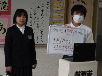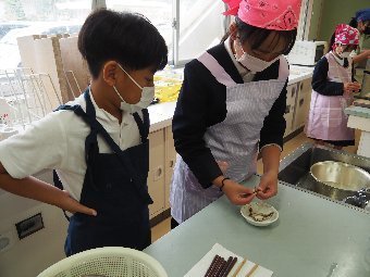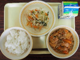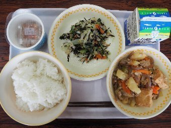 【放送原稿の紹介】今日の献立は,ごはん,牛乳,じゃがいものそぼろ煮,さわやか漬けです。食事のマナーの基本は人をいやな気持ちにさせず,お互いに気持ちよく過ごせるようにすることです。給食当番でマスクを外していたり,髪が帽子から出ていたりすることはありませんか。食べるときの姿勢はどうですか。食事中に騒いだり,口をあけたりしたまま食べて嫌な音を出していませんか。そして食事の前と後に,きちんと「いただきます」「ごちそうさま」のあいさつをしていますか。給食時間の自分の行動をふり返ってみましょう。