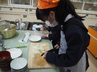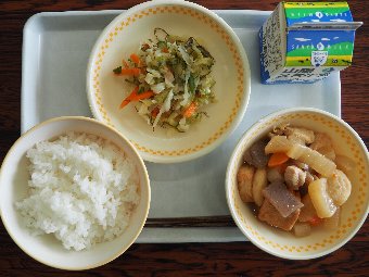 【放送原稿の紹介】今日の献立は,ごはん,牛乳,いも煮,みそいりこ,りんごです。今日は,山形県の郷土料理 「いも煮」を給食に出しています。いも煮は,お肉やさといも・こんにゃく・ねぎ等を一緒に煮込んだ料理です。山形県などの地域では,外で,大きな釜を使い料理をするイベントが開かれることもあり,寒い時期には心も体も温まる料理として昔から親しまれてきました。 給食は外での調理はできませんが,大きな回転釜を使い,たくさんの食材をしっかり煮込むことで,お肉や野菜のうま味がたっぷり溶け出していると思います。味わっていただきましょう。