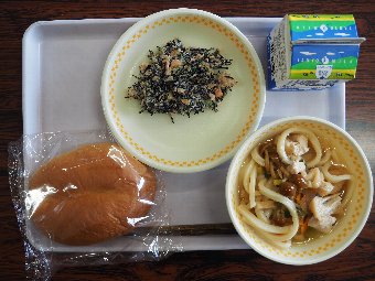 【放送原稿の紹介】今日の献立は,小型セサミパン,牛乳,わかめうどん,ごぼうサラダです。今日は「だし」についてのお話です。「和食」の基本にあるのが「だし」です。だしは料理にうま味と風味を与え,素材のおいしさを引き立たせます。給食では「かつおだし」「昆布だし」「煮干しだし」が多 く使 われます。それぞれの特徴から相性のよい料理に使いますが,2種類を「合わせだし」として使うこともあります。合わせだしはうま味の感じ方が数倍にも強くなります。うま味成分には健康に役立つ働きもあり,うす味の料理もだしを効かせると物足りなさを補いおいしく食べられるので減塩効果につながります。