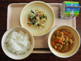 【放送原稿の紹介】今日の献立は,ごはん,牛乳,ポークカレー,りっちゃんのサラダです。今日は「りっちゃんのサラダ」です。1年生の国語科の教科書の「りっちゃんのサラダ」を覚えていますか?りっちゃんは,病気になってしまったお母さんのためにおいしいサラダを作り,そのサラダを食べたお母さんはたちまち元気になったというお話でした。りっちゃんのお母さんは,なぜ元気になったのでしょうか。それは,このサラダには赤黄緑 のグループの全ての食べものが入っていること,りっちゃんの優しい気持ちが込められていたサラダだったからかもしれないですね。りっちゃんと同じように,調理員さんも「元気に過ごしてほしいな」という優しい気持ちを持って毎日の給食を作ってくださっています。サラダを食べて元気になりましょう。