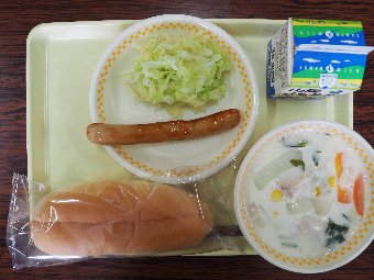 【放送原稿の紹介】今日の献立は,背割りパン,牛乳,ホットドッグ,チンゲン菜のミルクスープです。今日の給食は「ホットドッグ」です。ホットドッグは焼いたり,ゆでたりしたソーセージをパンではさむ食べ物 です。このホットドッグという名前は,ドイツから伝わったソーセージが,犬の形に似ていることから「ドッグ」と呼ばれるようになり,ソーセージを温めて提供することから「ホット」とつけられ,ホットドッグとなったそうです。アメリカでは,野球場で販売されたことをきっかけに国民食として広まっていきました。給食では,パンにゆでキャベツとフランクフルトをはさんで食 べます。こぼさないように,お皿の上で上手に食べましょう。