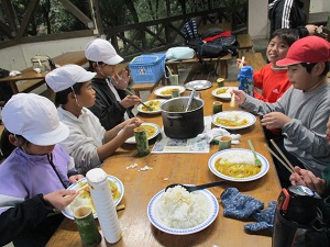 ふれ愛ランドに到着後、さっそく竹コップ・竹スプーン作りを行いました。班のみんなで協力し、固い竹を切ったり削ったりしてオリジナル食器が完成しました。午後からは飯ごう炊さんです。火の起こし方や米の炊き方を教わった後、班ごとに作業スタート。それぞれの役割に分かれて、お互いに声を掛け合いながらカレー作りを進めました。無事に美味しいカレーが完成し、作った竹スプーンを使って食べました。藤井さんをインストラクターに迎えたキャンドルファイヤーでは、友情の火を囲んでいろいろなゲームを楽しみました。向井先生に星空案内もしていただき、充実した1日目が終了しました。