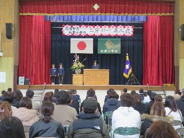 2月3日(火),4年生の二分の一成人式が行われました。前半は体育館での式でした。全員の気持ちがそろっており,その中でも代表3名による誓いの言葉は,素晴らしかったです。後半は各教室に分かれて一人ひとりが保護者の方に向けての作文を読み,クイズ大会が行われました。改めて,お家の人へ,育ててくれた感謝の気持ちや将来の希望が再確認できた式でした。終わった後の子どもたちの表情がとても良く,良い式になったこと,やりきったことが伝わってきました。保護者の皆様,これからも子どもたちの活躍を楽しみにしていてください。出席いただきありがとうございました。
