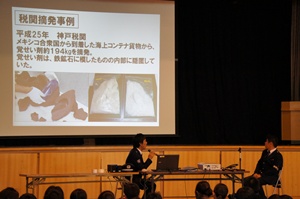 今年は,神戸税関福山税関支所尾道糸崎出張所の税関の方に来ていただき,税関の仕事内容や,覚せい剤・危険ドラッグなどの薬物の危険性について説明をしていただきました。