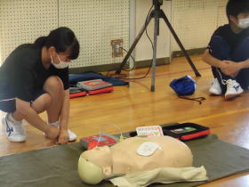 防災についての講話を聞いた後で,各学年が3つのグループに分かれ,簡易担架,人員運び,ロープワーク,水嚢,心肺蘇生,AEDの使い方などを学びました。