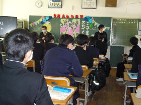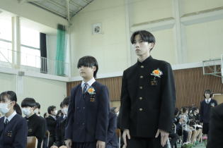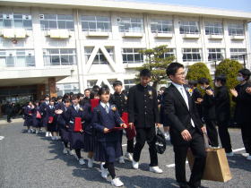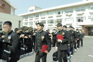 | 令和4年度 第76回卒業証書授与式を挙行いたしました。 2年生は会場で参加,1年生はMeetにより教室での参加となりました。 また,参列頂きましたご来賓の皆様,保護者の皆様,誠にありがとうございました。 在校生からは代表の生徒会長が送辞を贈りました。 また,卒業生からの答辞では,3年間の様々な思い出や在校生,教職員,保護者の皆様への熱い感謝の言葉が述べられました。 卒業生70名(男子42名・女子28名)は,無事卒業証書授与式を終え,柔らかな日射しに恵まれる中,最後の写真撮影を行い,保護者の皆様や在校生・教職員と別れを惜しんでいました。 |