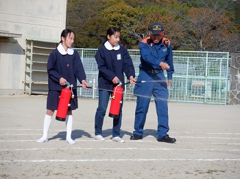 12月6日(金)、火災避難訓練を行いました。今回はグラウンドへの避難だけでなく、消火器や避難器具(救助袋)を使った訓練も行いました。想定は「家庭科室から出火」です。