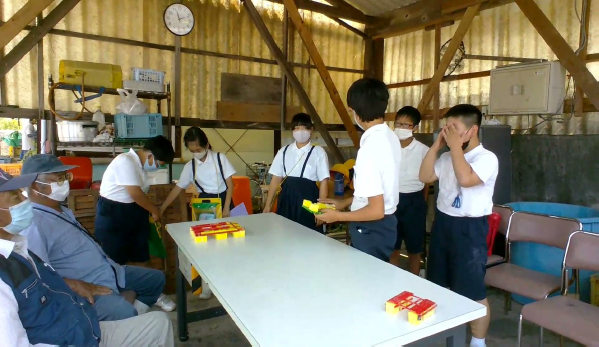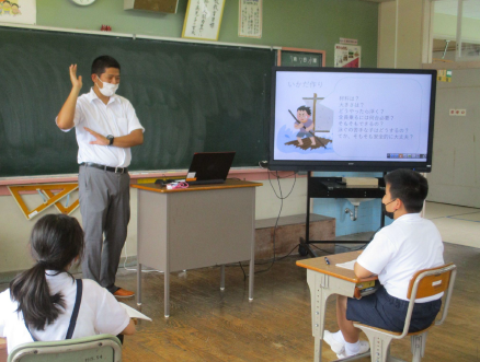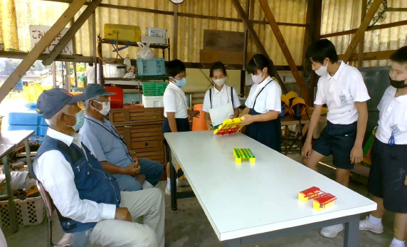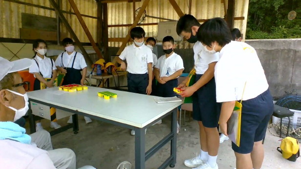 僕たちが作ったイカダの模型を見ていただくために向島漁協組合に行きました。 イカダの模型は3チームに分かれて作ったものを見ていただきました。 自分たちで作ったイカダの模型を紹介した後は、わからないことやもっと知りたいことを質問をして、漁協組合の人たちに答えていただきました。 イカダ作りに向けて、いろいろなアドバイスをいただきました。 |
