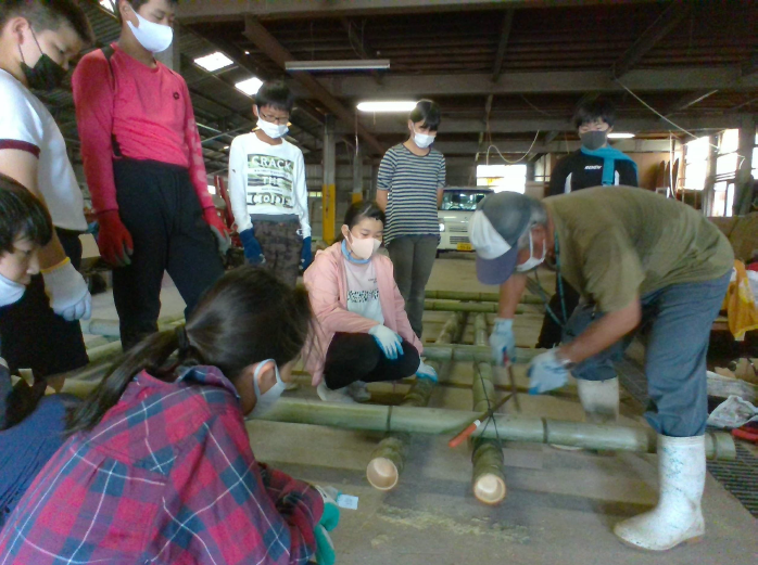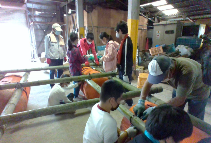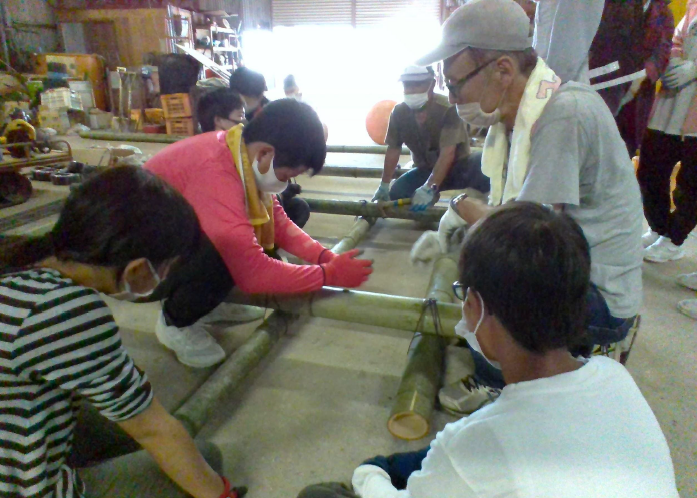 向島漁業協同組合の方に教えていただき、いかだ作りに挑戦しました。 友達と協力して、切ってきた竹を運んだり、縛ったりしました。 |
