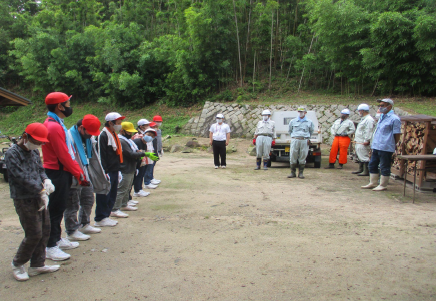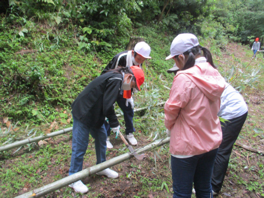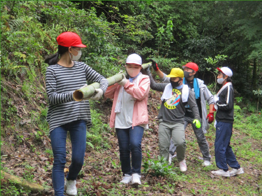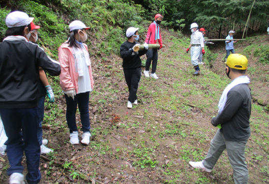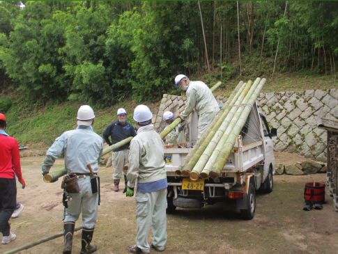 イカダの材料である竹を取りに行きました。 切った竹を運ぶ係と運んだ竹に付いている枝を切る係に分かれ、作業しました。 切り終わった竹は、向島漁業組合の倉庫へ運びました。 竹切りに協力していただいた人たちにお礼を言い、学校に帰りました。 |