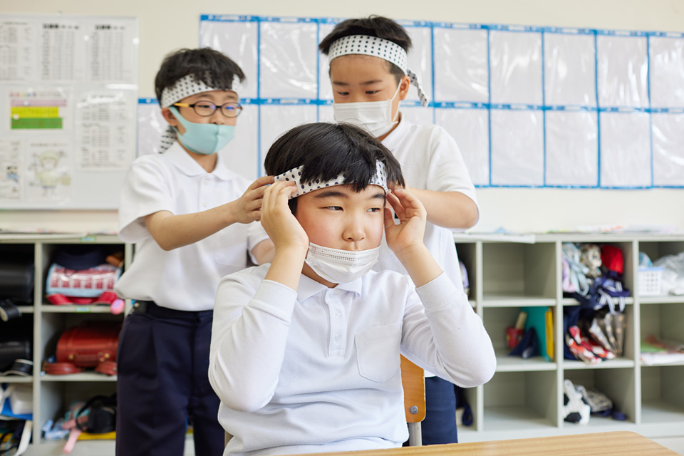 そして、男子は豆しぼり。女子は髪飾りを付けてみました。