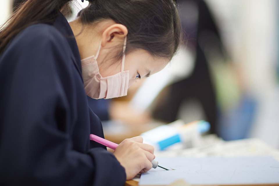 自分で考えた、不思議な花を彫刻刀で彫っています。