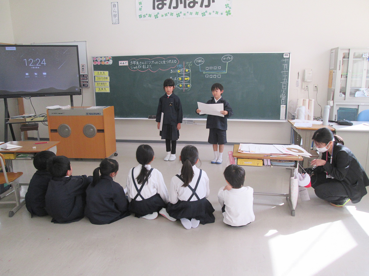 生活科で学習したことを3年生に紹介するために、発表の練習をしています。