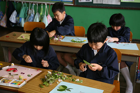 花びらや木の実、草などを使って作品を作りました。