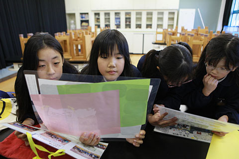J-KIDS大賞表彰式のレセプションで、他の小学校からいただいたメッセージボードを、報道委員会のメンバーが見ました。
