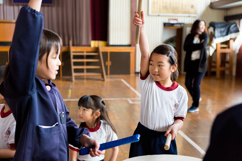 1年生の朝の太鼓の練習です。6年生が指導しました。