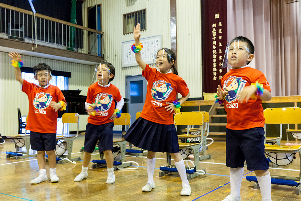 広島東洋カープとのコラボTシャツを着て、鍵盤ハーモニカの演奏やダンスをしました。