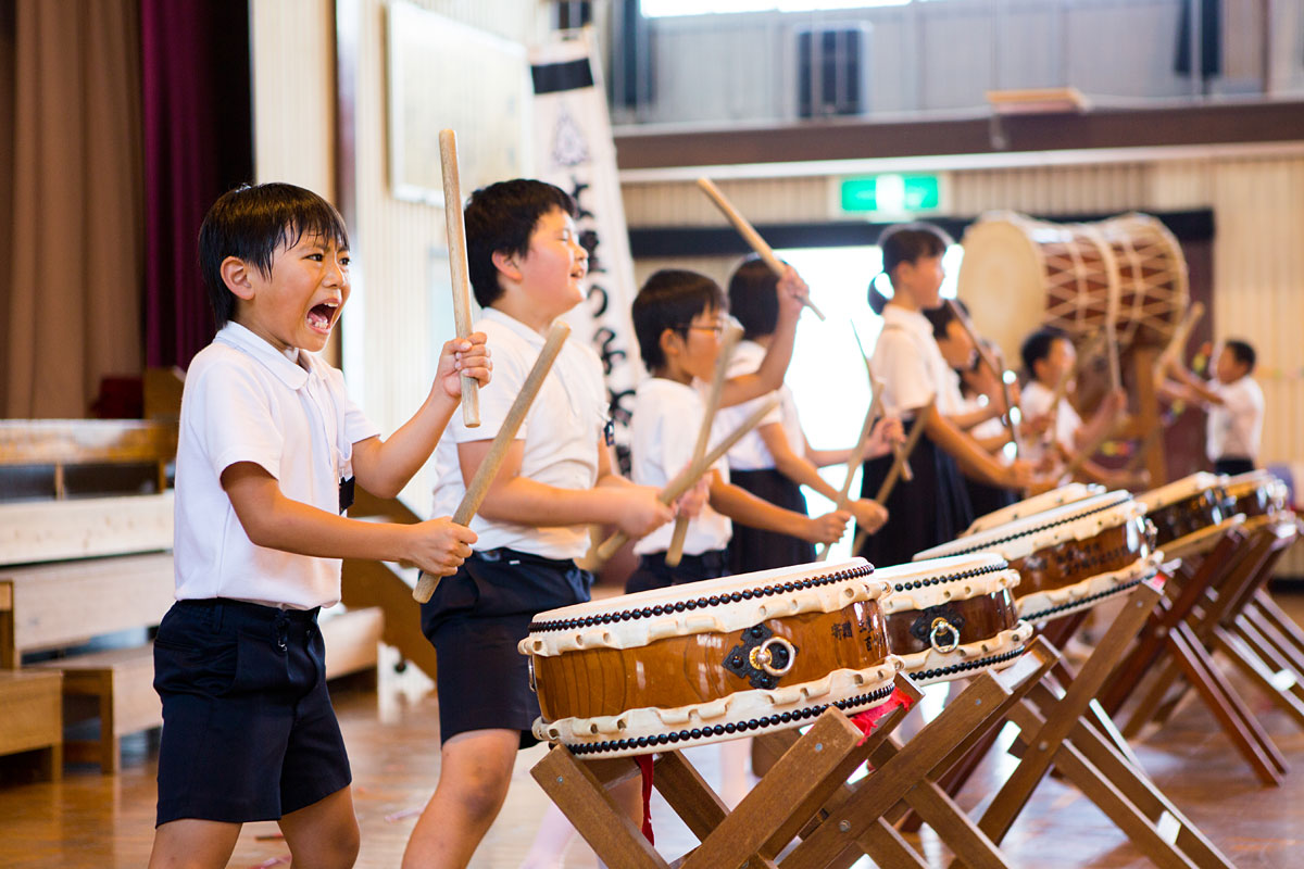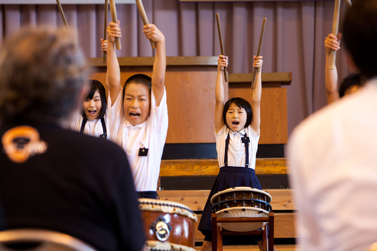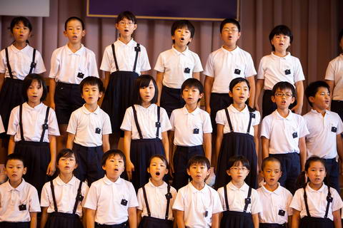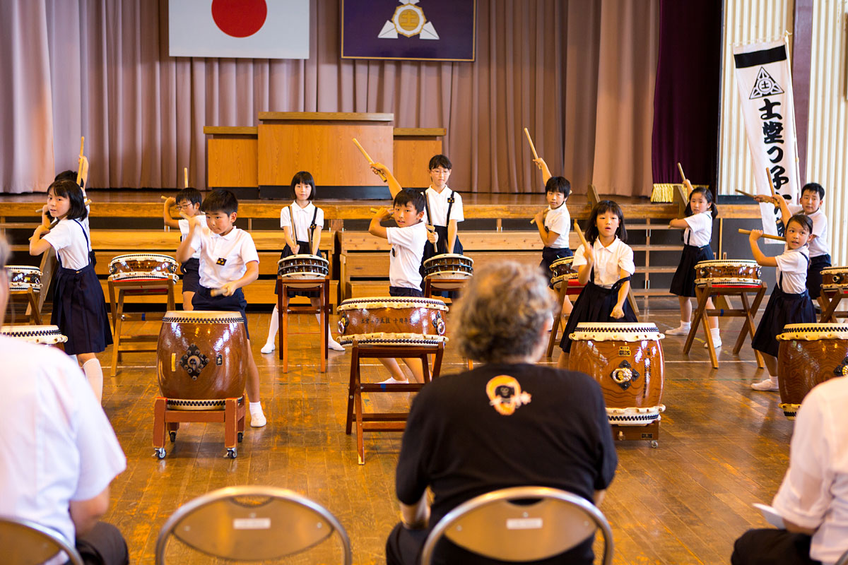 体育館で合唱と土堂っ子太鼓を聞いていただきました。